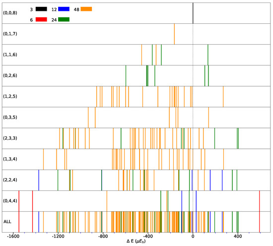 Only 21 of the 162 SICs are less stable than REF. At constant, the most stable configuration of () is always more stable than any of the (). This suggests that a few relative orientations of the d orbitals are stabilizing.