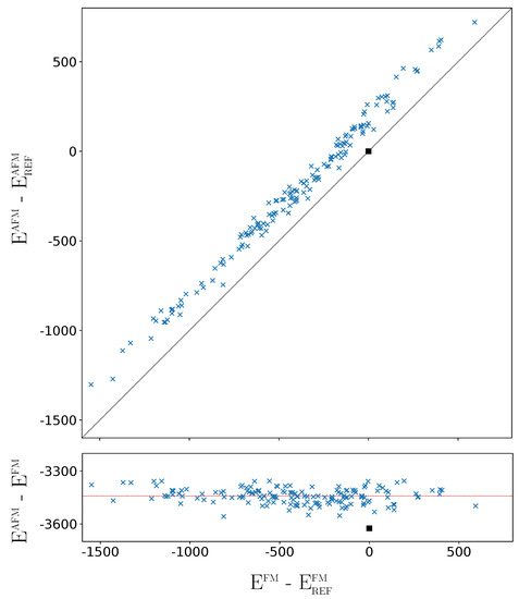 Difference between the AFM energy of the 162 SICs with respect to the REF case (top panel), and difference between the AFM and FM energies (bottom panel) as a function of the relative FM energy. The horizontal line corresponds to the average stabilization energy of the AFM solutions with respect to the FM ones. In both panels, energy at the B3LYP level (for 2 f.u. in E). The square indicates the REF case.