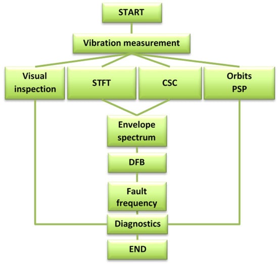 The scheme of diagnostics methodology: STFT—short FFT; CSC—cyclic spectral coherence; PSP—phase space plot; DFB—diagnostic frequency band.