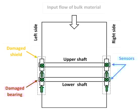 Vibration sensors’ (accelerometers) placement on the upper and lower shafts of the vibrating screen.