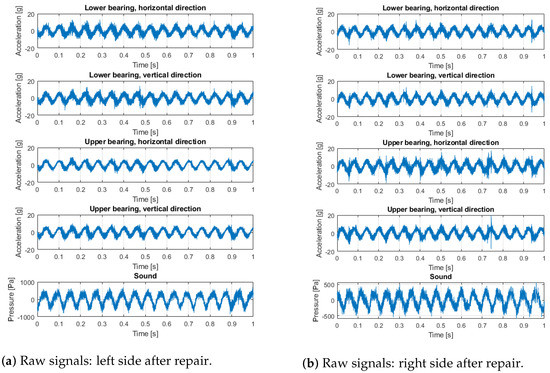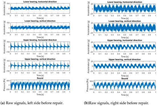 Measurements were made using the Kistler LabAmp 5165A data acquisition system, Kistler 8702B500 accelerometers, and Bruel & Kjaer 4189 microphone. The places and directions of the accelerometers’ installation on both sides of the screen are shown in Figure 5. The sampling frequency of both vibration and sound signals was 50 kHz. The acoustic signal contains all effects from the loudest environmental sources. For this reason, the audio record is only used to validate the main machine operation cycles of shaft rotation observed in the vibration data, since the rotation sensors were not used in these experiments. The raw signals collected on the machine (before bearings replacement—with expected bearings problems—and after bearings replacement with new bearings installed) are presented in Figure 6 and Figure 7. The measurements were taken on the left and right sides of the screen, in two directions.