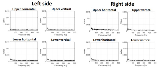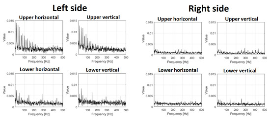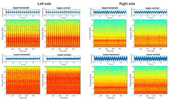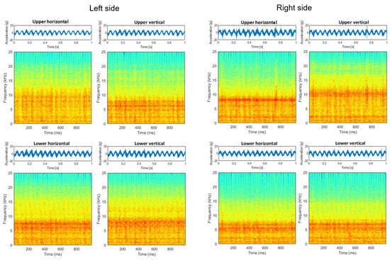 Signals from the screen are highly nonstationary, thus time–frequency analysis is a reasonable approach to understanding the properties of the signal. In Figure 8, signals and the corresponding spectrograms of these signals are presented. It is seen that signals from the left side (both horizontal and vertical directions of the upper left bearing) are highly dominated by cyclic impulses. The period of these impulses is related to rotational frequency, and the reasons for these impulses are mechanical shocks. It is also seen on the upper bearing on the right side (vibration transmission effect), as well as on the lower left bearing. This phenomenon is barely observed on the lower right bearing, as the distance between excitation and the sensor is the biggest in all cases. It is worth noticing that the lower left bearing generates a lot of noise (in the sense of amplitude as well as spectral content—it is more wide-band than other signals).