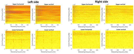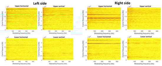 The time–frequency map allows us to understand spectral content and its variation over time, but to identify nonlinear modulation between components, it is better to use the CSC map presented in Figure 10 and Figure 11. In Figure 10, by analogy to spectrograms, one may see a family of modulating harmonics, however, there are two sources of modulation. First, it is seen that cyclic impulses in the time domain cause amplitude modulation. The carrier band is really wide, and modulating frequency is related to shaft rotation. This signature is present in each CSC map, the most significant modulation is visible in pictures related to the left upper bearing. The second source of modulation is related to the faulty bearing. The fault frequency is equal to 141 Hz. The clearest picture is related to the lower bearing in the vertical direction. The fundamental frequency and two harmonics are seen. As the fault signature is rather weak, it is not visible on other maps (from other sensors).
