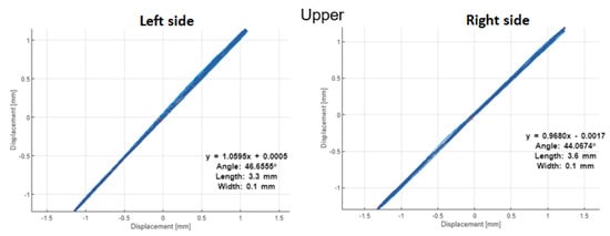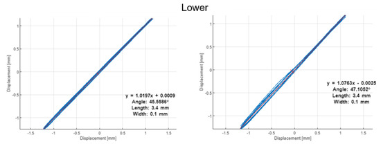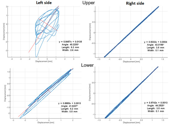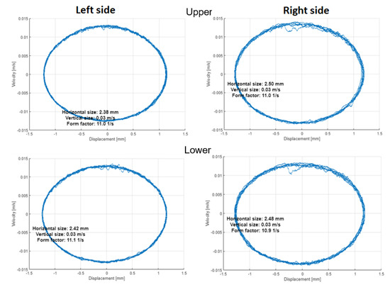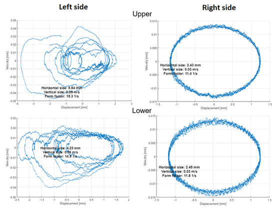 The orbits in Figure 14 and Figure 15 with PSP in Figure 16 and Figure 17 are built by the vibration signals recorded before bearing replacement and right after repair, respectively. The difference is visible between the trajectories of shaft motion affected by the damaged shield on the upper left support and the bearing damage on the lower left bearing. Since all corresponding graphs have the same scales on both axes, we can conclude that external excitation from the vibrator’s impacts on the shield affects both the orbit and PSP of the upper shaft, while the bearing defect has less effect in the orbit but significantly changes the PSP. The numerical values of orbits and PSP geometry parameters are summarized in Table 2 for the damaged bearing (left side of the lower shaft). The form factor of PSP and angle of orbit inclination are both less sensitive to either the external excitation or the internal bearing defect, because these parameters of dynamics are mainly determined by the screen design (total vibrating mass, supporting springs stiffness, and vibrators’ positions). The size parameters of orbits and PSP were significantly changed due to bearing defect.