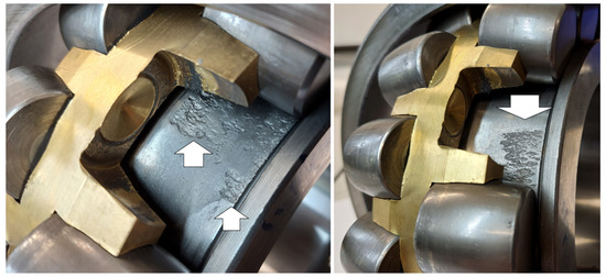 The special series SKF 22234 VAJ spherical roller bearings (see Figure 4) installed on the vibrators’ shafts can accommodate heavy loads in both directions. They are self-aligning and compensate shaft misalignment and deflections, with virtually no increase in friction or temperature. Nevertheless, these elements of vibrators are subjected to high loads and cyclic fatigue. By the specification of the producer (SKF), bearings for the vibrating sieving screen have greater than normal clearances, which play the most important role in their durability [73,74].