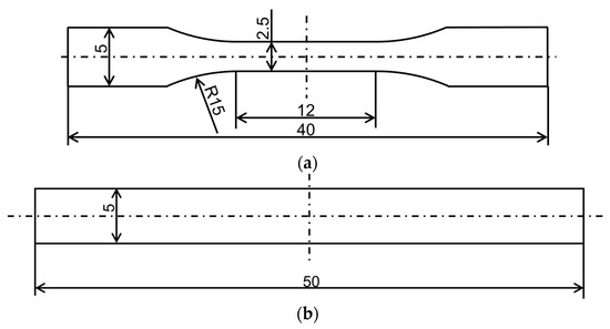 Specimen geometries: (a) dumbbell thickness: 1 mm; (b) beam thickness: 2 mm.