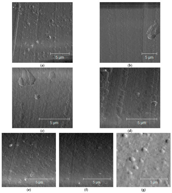 Morphologies of PC/PS/nano-fillers: (a) PC/PS; (b) PC/PS/clay (90/9.95/0.05); (c) PC/PS/clay (90/9.9/0.1); (d) PC/PS/clay (90/9.7/0.3); (e) PC/PS/silica (90/9.95/0.05); (f) PC/PS/silica (90/9.9/0.1); (g) PC/PS/silica (90/9.7.0.3).