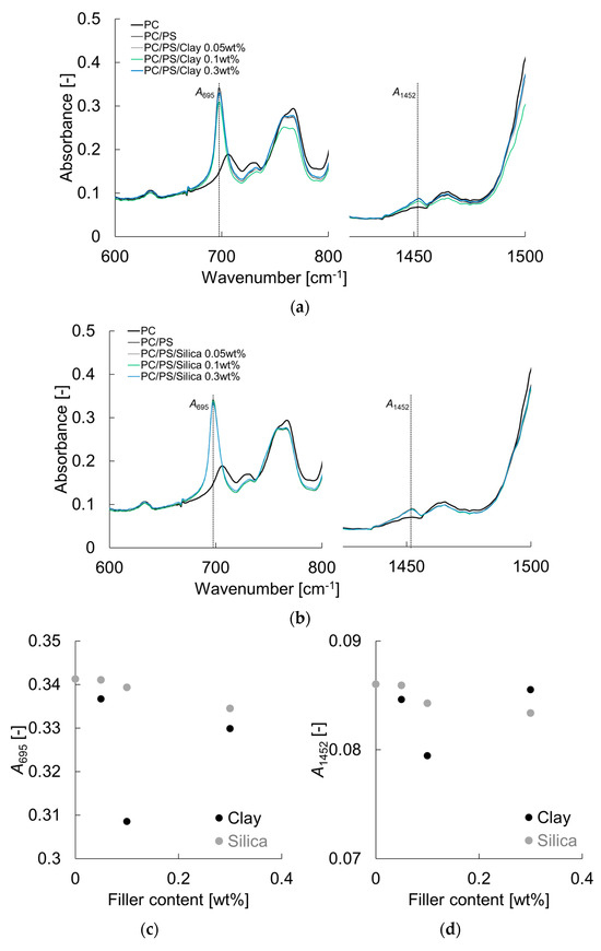 Figure 3 shows the FT-IR results and the dependence of the inorganic particle addition on the absorbance at 695 cm−1 (A695) and 1452 cm−1 (A1452). Both absorbance values show a tendency to decrease with the addition of inorganic particles, with the clay showing a greater decrease. This suggests that clay has a stronger interaction force and strongly constrains the PS molecular chain. This may be due to the larger size of the primary particles of clay, which may result in a higher intermolecular force per particle.