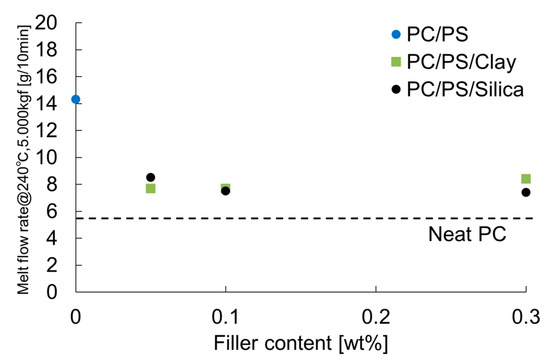 Melt flow rates of PC/PS/nano-filler composites.