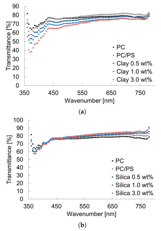 Transmittances of PC/PS/nano-filler composites: (a) PC/PS/clay; (b) PC/PS/silica.