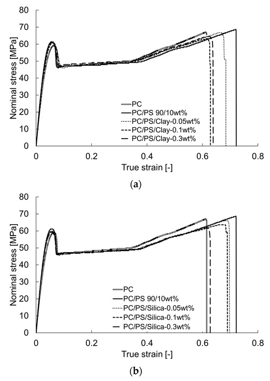 Nominal stress–true strain curves of PC/PS/nano-filler composites: (a) PC/PS/clay; (b) PC/PS/silica.