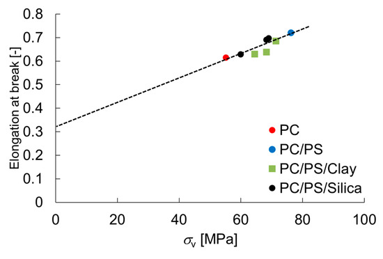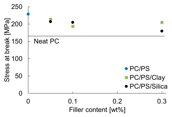 The fracture stress of PC obtained with this equation was approximately 165 MPa. Although this stress is slightly higher than the reported breaking stress, this method reproduces the approximate value [19]. Figure 8 shows the relation between the fracture stress and the inorganic particle content.