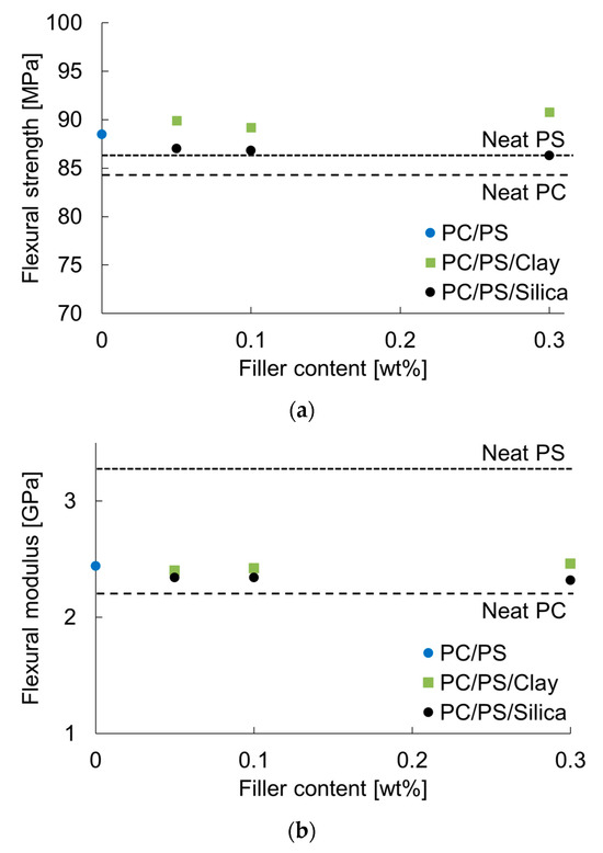 Figure 9 shows the results obtained for the flexural strength and modulus. Blending 10 wt% PS with PC increased the flexural strength and flexural modulus. The flexural strength tended to increase when a small amount of clay was dispersed as inorganic particles. The same value decreased slightly when a small amount of silica particles was dispersed. However, the flexural modulus did not change greatly with the micro-dispersion of the clay, but it showed a tendency to decrease with the micro-dispersion of silica particles. This finding suggests that the flexural modulus tends to decrease with the fine dispersion of PS and that the clay itself has a reinforcing effect on the modulus. Table 4 shows the E and υ values of PC and PS, as estimated using the method shown in Section 2.6. The table shows that the E of PS was larger than that of PC, while the υ of PC was larger than that of PS. These results suggest that the E is increased by blending PS with PC and the υ is decreased. Table 5 presents the results of the elastic modulus evaluation of the PC/PS polymer blends. The table shows that blending PS with PC increased E and decreased υ. This trend became more pronounced when inorganic particles were added to the system.