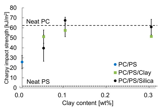 Figure 10 presents the effects of adding inorganic particles on the Charpy impact strength. The same figure also presents the results for PC and PS alone for comparison. The Charpy impact strength of PC blended with PS decreased but that of PS blended with a small number of inorganic particles tended to increase. In particular, when the inorganic particle content was 0.1 wt% or more, the Charpy impact strength was found to be equal to or greater than that of PC.