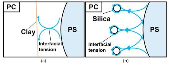 Figure 11 depicts models of the surface tension of plate-like and spherical particles. The surface tension of a plate-like particle acts parallel to the plane direction, leading to anisotropy in the surface tension of the platelets. In other words, the effect of the dispersed phase for reducing the interfacial tension depends on the platelet direction of orientation. In contrast, the surface tension of spherical particles is isotropic. Therefore, silica particles are more isotropic in reducing the interfacial tension of the dispersed phase. This point must be considered when stabilizing the quality of polymer blend molded products. Silica particles are better suited to the purposes of this study. In other words, even if the interaction force is weak, the isotropic force is more dominant and the silica contributes to the fine dispersion of PS in smaller amounts.
