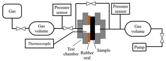 Hydrogen permeability tests were carried out using the Gas Reaction Automated Machine (GRAM, TPU, Tomsk, Russia) equipped with a gas permeation cell. For the hydrogen permeability test, the samples were placed in a test cell with a rubber sealing gasket. The active surface area of the specimens was 1.9 × 10−5 m2. The cell was evacuated to a residual pressure of 1 × 10−3 Pa on both sides of the sample. The tests were performed at room temperature (25 °C). On the gas supply side, the hydrogen pressure was set to 0.1–0.9 MPa. The gas pressure drop was measured on the precalibrated gas supply volume. The schematic diagram of the setup is shown in Figure 1.
