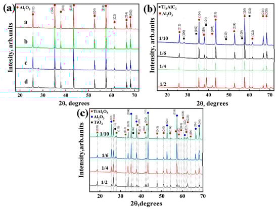 XRD patterns of (a) porous Al2O3 at different sintering temperatures: a—1500 °C, b—1450 °C, c—1400 °C, d—1350 °C; (b) green bodies before sintering and (c) porous composites obtained from Ti3AlC2/Al2O3 powders.