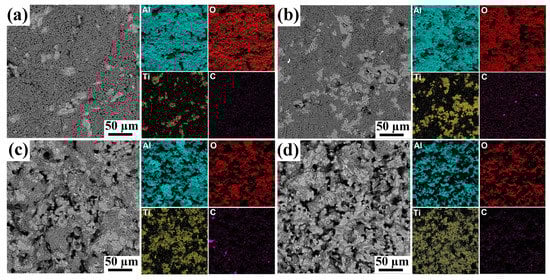 SEM images and corresponding EDS elemental maps for porous composites obtained from Ti3AlC2/Al2O3 mixture: 1/10 (a), 1/6 (b), 1/4 (c) and 1/2 (d).