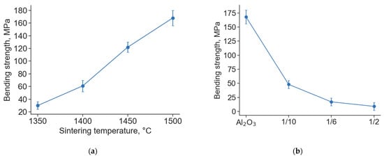 For pure Al2O3 samples, the bending strength increases from 25 to 165 MPa with an increasing sintering temperature from 1350 to 1500 °C, respectively (Figure 4). We used a commercial Al2O3 powder for which the manufacturer recommended a sintering temperature of 1580 ± 30 °C to obtain dense material. Lower sintering temperatures were used to obtain a microporous structure of the material and to analyze the influence of its porosity on the bending strength. It was demonstrated that the strength of all investigated Al2O3 samples remains at a sufficiently high level compared with alumina support materials with similar density produced in other works [26,27,28]. The bending strengths of the alumina samples with acceptable porosity for support material (obtained at 1350 and 1400 °C) were 25 and 60 MPa, respectively.