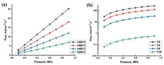 The permeability tests show the dependence between hydrogen permeation flux through the samples and gas pressure (Figure 5). The results showed near linear dependence of hydrogen flux on pressure for all the alumina samples (Figure 5a). The flow rate increases from 5 to 25 mol/(m2 × s) (0.9 MPa pressure) when the sintering temperature increases from 1350 to 1500 °C, respectively. Thus, the increase in porosity of Al2O3 results in a fivefold higher gas flow through the samples (Figure 5a). It can be seen that the increase in the Ti3AlC2/Al2O3 ratio and the corresponding porosity result in higher hydrogen flux through the samples. Similar dependence between the flux and gas pressure was found for all the samples in the investigated hydrogen pressure range. The hydrogen flux for the sample with 1/10 ratio is in the range of 0.06–0.4 mol/(m2 × s), which is relatively low for support materials. The maximum flow of 30–200 mol/(m2 × s) was achieved for the sample with the highest porosity (1/2 ratio), which is suitable for ceramic-based supports developed for gas separation membranes [29].