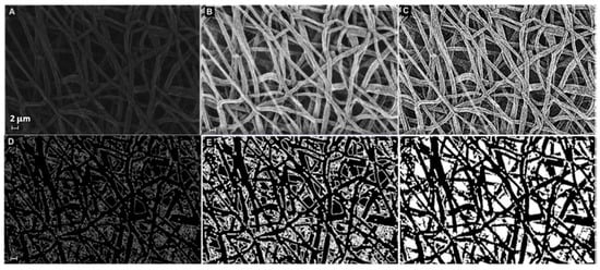 Sequence of image processing using MATLAB functions to prepare the input file for DiameterJ: (A) original SEM, (B) applied “histeq” and “medfilt2” functions, (C) applied “imsharpen”, “smoothing”, and “cleaning” functions, (D) applied “find edge” function, (E) applied “imdilate” function, (F) performed “imfill” function using ImageJ (scalebar is the same and equal 2 µm for all panels).