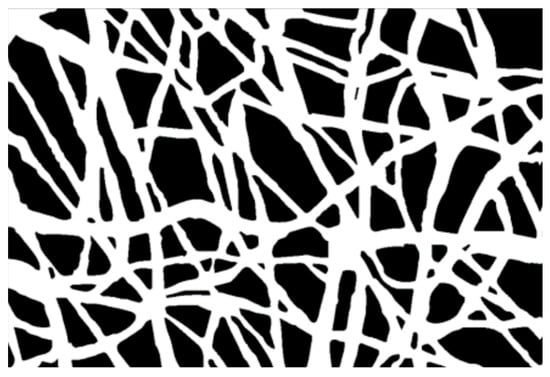 The microstructural texture of the electrospun mats was examined using field emission gun scanning electron microscopy (Leo 1530, ZEISS, Germany) operated at low voltage (i.e., 1–5 kV range) to investigate the fiber diameter without metal coating. The membrane thickness was also evaluated using SEM on the sample cross-section. Micrograph images at 5× magnification were taken and saved to be used in the analysis of fiber diameter, by sampling at least 30 individual fibers, with the software "ImageJ" (Rasband, W.S., ImageJ, U. S. National Institutes of Health, Bethesda, MD, USA, http://imagej.nih.gov/ij/, accessed on 30 December 2022, 1997–2022). The mean value and root mean square error (RMS) of the FD sample distribution were computed for each treatment over three micrographs taken randomly at different locations. Each image was segmented, i.e., transformed into binary images with white fibers on black background, and then analyzed after extracting a sample distribution of fiber diameters using DiameterJ []. As additional pre-processing, the segmentation was elaborated beforehand using MATLAB software (The MathWorks, Natick, MA, USA), applying the sequence functions in Figure 1. Image histogram equalization was operated on the starting SEM micrograph (Figure 1A) to increase the contrast, reduce noise, and preserve the structure edges. Moreover, local thresholding was performed to separate the outer fiber network from the background. The sequence of morphological operations, in the same way as described in the first strategy, followed. Finally, the filling function was performed manually on the latter binary image using “Image J” software. The result of this sequence of image processing steps is illustrated in the example in Figure 1, which is a black and white image (Figure 1F) that can be further treated in order to make the segmented object look more natural and smooth, e.g., using Adobe Illustrator (Adobe Illustrator, Adobe Inc., San Jose, CA, USA), such as in Figure 2.