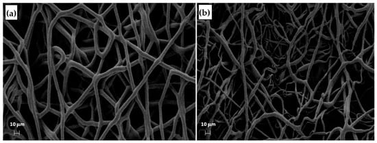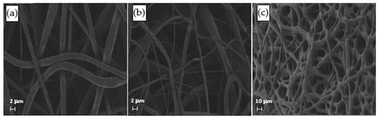 The water contact angles of the PCL electrospun samples were measured using an optical contact angle measuring system, OCA 20 (DataPhysics, Germany), equipped with SCA 202 software, using ultra-pure water and operating at room temperature. Determinations were made using the sessile drop method with 10 μL droplet volume and a deposition rate of 10 µL/10 s in compliance to the European Standard UNI EN 15802 []. Ten measurements were carried out for each sample from different locations, and the average value is reported with its standard deviation (SD). The static contact angle ϑ, in degrees, is estimated from the diameter of the contact surface (d) and the height of the drop (h) as:
