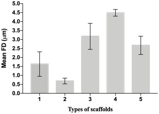 The mean value and spread of the first five scaffolds from DiameterJ. The histogram shows simultaneously the Y1 and Y2 of each scaffold from Table 4. Data are expressed as the mean ± SD (p-values < 0.05 is the significance interval).