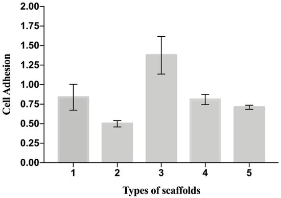Cell adhesion on the scaffolds measured as ratio number of cells attaching to the scaffold to the number of cells attaching to the well. Data are expressed as the mean ± SD (p-values < 0.05 is the significance interval).