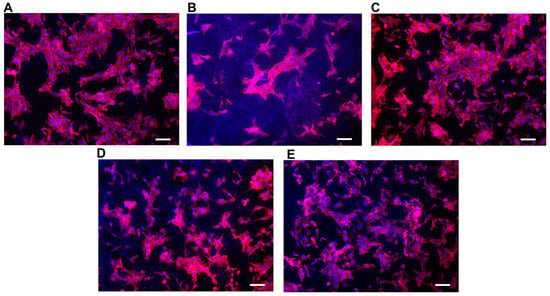 Representative images of C2C12 cells on the different types of scaffolds showing F-actin (red) into cytoplasm and nuclei stained with DAPI (Blue). Scale bars = 30 μm for (A–E).