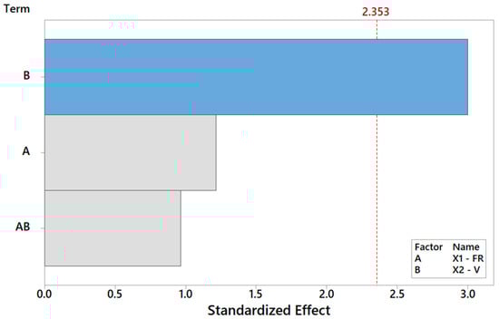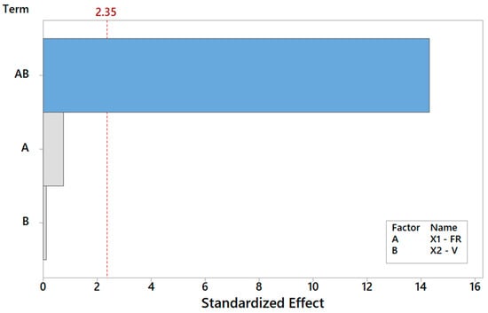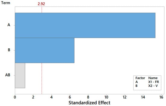 Let us discuss the procedure to select a reduced model for Y1. As mentioned above, one major benefit of the DOE factorial approach is the possibility to quickly refine the analysis and identify the simplest model by removing non-significant terms. By proceeding step wise from a full model, the backward elimination algorithm starts with all predictors in the model and removes the least significant variable for each step one at a time. The MINITAB algorithm stops when all variables in the model have p-values that are less than or equal to the specific significance value, i.e., 10% in our case. Table 6 provides the Y1 model generated by “dropping” all terms that exhibit a p-value > 0.1, where two terms are found to be significant. Note that the coefficients of the “kept” terms do not need to be re-estimated because of the orthogonality property of the DOE. The relevant terms can be ranked by importance either by their (decreasing) p-values or, more intuitively, via their (increasing) t-values [,,]. For coded models, the absolute value of each t-value conveys a standardized measure of the associated effect/interaction and can be arranged in a Pareto histogram as portrayed in Figure 7, which offers an overall pictorial perspective that is more convenient to comprehend and analyze than Table 5. The model explains 99.28% of the variability in Y1 and can predict the mean FD to within ±0.348 μm (±2·MSE), corresponding to a 90% confidence level. In terms of the t-value, any effect in Figure 7 that exceeds the reference line for t0 = 2.92 is significant at a 10% significance level, consistent with Table 6. The single most important effect on Y1 is the FR (ref. A = X1), followed by V (ref. B = X1). The FR and V are the real controlling variables of the FD, whereas the interaction term between the FR and V is negligible, as correctly concluded in Section 3.1.1.