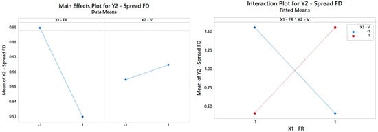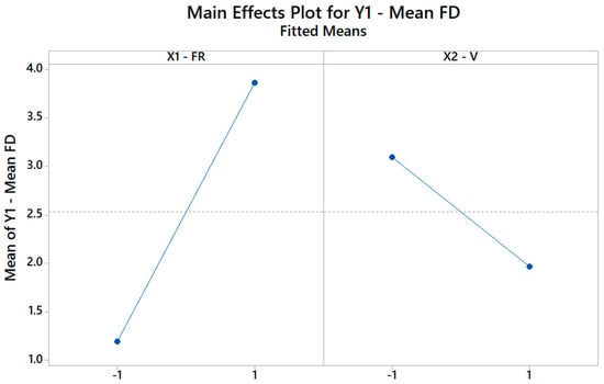 Figure 8 illustrates how the FD changes when the FR changes from its low level (−1) to its high level (+1), assuming the other factor, i.e., V is kept constant, and vice versa. Remarkably, since C2 is negative, increasing the V (X2) does increase the FD. Hence, through the DOE, it is possible to not only identify but also quantify the role of each input parameter on the selected output properties.