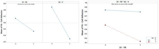 Finally, focusing on the last output parameter in our analysis Y6, the biocompatibility of the PCL scaffolds is captured using a reduced model where only the main effect V is significant, according to Table 8. The Pareto ranking and the factor plots for Y6 are displayed in Figure 11 and Figure 12. The modest R2 (75%) is an acceptable result for engineering purposes, also considering the extreme simplicity of 1-term model, but it also means that more information (e.g., more observations, more regressors, or higher terms) could be included in future analysis to substantially improve the statistical fitting.