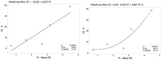 Generally speaking, establishing correlations between the Ys is useful for engineering purposes and represents a valid challenge for future studies to improve the DOE results, as already pointed out in a previous paper []. The DOE analysis of the Y–X relationships can be augmented indeed with additional regression studies exploring the Y–Y relationships between outputs in the given multi-response dataset (ref. Table 5). For example, it is possible to run an ANOVA to correlate Y5 with Y1, especially since scaffolds with larger FDs were discussed to be generally stiffer in Section 3.1.2. The linear model (R2 > 78.6%) in Figure 14 in fact confirms this trend but also points out that the data may suggest a curvature effect. A quadratic model actually improves the data fit considerably (R2 > 90%) and renders a better model for predicting Young’s modulus from the mean FD for the scaffolds and vice versa. Such a model hence provides an alternative option that can be used either synergistically or in place of the DOE models, depending on the design or manufacturing task at hand.