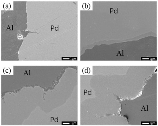 Figure 2 shows SEM images of Pd/Al composite wires annealed at 200 °C for different times, with Al in the darker areas and Pd in the lighter areas due to the difference in lining degree. As can be seen from the figure, when the annealing time is relatively short (as shown in Figure 2a), no intermetallic compound layer is observed at the interface of the material. When the annealing time reached 60 s (as shown in Figure 2b), a thin layer of the intermetallic compound appeared at the interface of the two phases of the material. With a further increase in annealing time, the intermetallic compound layer of the material further thickened, increasing to an average of about 0.85 μm at 7200 s, and when the annealing reached 10,800 s (as shown in Figure 2d), the thickness of the interfacial layer reached about 1.1 μm.