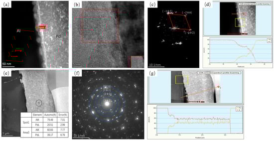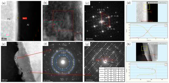 Figure 9 shows TEM images of annealing at 350 °C for 5 s and 10,800 s. At an annealing time of 5 s, a continuous and homogeneous layer of the intermetallic compound appears at the interface of the material with an interfacial layer thickness of approximately 7.3 nm. Based on the EDS results at position 1 (Figure 9f) and its Fourier transform image (shown in Figure 9c), it is considered that an orthogonal Al3Pd5 phase in the (1 0 −2) direction is generated at this point. As the annealing time was increased to 10,800 s (shown in Figure 9e), two compound layers appeared at the interface of the material, where the thin layer showed crescent-shaped growth, and the combination of EDS results (shown in Figure 9h) and SAED results showed that the intermetallic compound layers at positions 2 and 3 were the Al3Pd2 and AlPd layers, respectively.