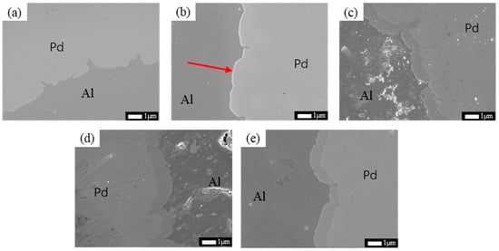 Figure 4 shows SEM images of Pd/Al composite wires annealed at 250 °C for different times. A thin interfacial layer can be seen at 250 °C when the annealing time reaches 30 s (as shown in Figure 4b) at the interface of the material. With increasing annealing time, the intermetallic compound layer at the interface of the material thickens rapidly with an average thickness of about 0.67 μm when the annealing time is increased to 1800 s (as shown in Figure 4c). It is worth noting that with a further increase in annealing time, the thickness of the interfacial layer of the material does not vary significantly, with annealing time of 3600 s (as shown in Figure 4d) and 10,800 s (as shown in Figure 4e), respectively, both being around 1.163 μm. It indicates that, in the early stages of annealing, the mutual diffusion of Pd and Al is rapid due to direct contact, but as the intermetallic compound layer is created, the diffusion drive decreases, resulting in the slow growth of the interfacial layer. This phenomenon was also seen in the samples annealed at 200 °C.