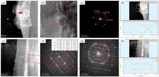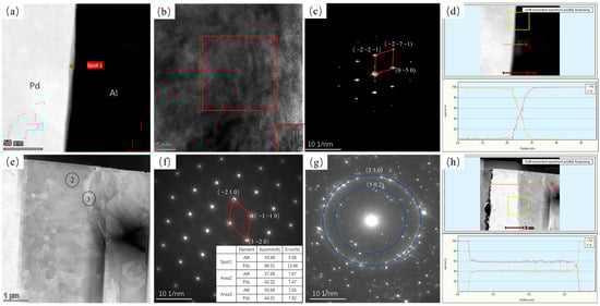 Figure 5 shows TEM images of annealing at 250 °C for 5 s and 10,800 s. Figure 5a shows that, at this temperature, the material generates intermetallic compounds on the interface at the early stage of annealing that are extremely small and discontinuous, with an intermetallic compound thickness of about 30 nm, and the generated intermetallic compound is a hexagonal Al3Pd2 phase in the (0 0 1) direction (as shown in Figure 5c). At an annealing time of 10,800 s, two different intermetallic compound layers appeared at the interface of the material, in the region of position 2 and position 3 in Figure 5e, with the hexagonal Al3Pd2 phase (black quadrilateral in Figure 5f,g) and the tetragonal Al21Pd8 phase (red quadrilateral in). According to the diffusion phase ratio, only one phase can be present in the diffusion region for both metals. The EDS results suggest that the region at position 2 is the Al3Pd2 phase region and position 3 is the Al21Pd8 phase region. The presence of the Al21Pd8 phase was not directly observed at the beginning of the annealing process, indicating that the growth of the Al21Pd8 phase was backward. Due to the thin thickness of the Al21Pd8 phase, it was not observed in Figure 4.