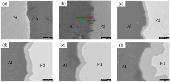 Figure 8 shows SEM images of Pd/Al composite wires annealed at 350 °C for different times. It can be seen that, at an annealing time of 5 s (as shown in Figure 8a), a white continuous intermetallic compound layer is observed at the interface of the material, and as the annealing time increases by 60 s (as shown in Figure 8a), the intermetallic compound layer of the material grows to about 0.48 μm. At an annealing time of 300 s (as shown in Figure 8d), the thickness of the interfacial layer of the material increased to 1.01 μm. This indicates that the interfacial layer grew faster and faster as the annealing temperature increased. When the annealing time came to 3600 s (as shown in Figure 8e), an off-white layer appeared at the interface, and it is believed that a new intermetallic compound was produced at this time. At an annealing time of 10,800 s (as shown in Figure 8f), the new intermetallic compound grows and appears as a white area in the diagram.