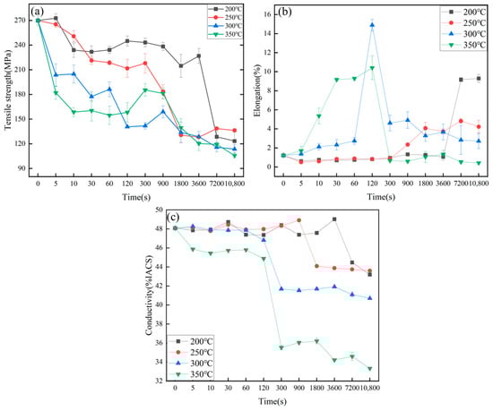 Properties of Pd/Al composite wires at different temperatures with annealing time: (a) tensile strength, (b) elongation, and (c) electrical conductivity.