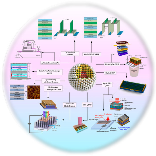 The major intraband transition-based photodetectors include ‘up to bottom’ devices, such as quantum well infrared photodetectors (QWIPs), and the emerging ‘bottom to up’ devices such as colloidal quantum dot (CQD) photodetectors. The infrared materials in QWIPs are grown based on the molecular beam epitaxy method. The technology of such devices is quite mature and has already been commercialized [10,11]. The dark current is low in QWIP, benefitting from the homogeneity of the quantum well. Besides, compared with HgCdTe bulk materials [12], it is simpler to fabricate larger-scale wafers on the quantum well. Still, there are disadvantages in QWIPs, such as low quantum efficiency, low operating temperature, the cumbersome production process, and that they cannot directly probe vertically incident radiation due to the transition selection rule [13]. Compared with the quantum well, the thermal carrier generation would be significantly reduced in quantum dots (QDs), which may benefit the high operating temperature. More importantly, there has been great progress in the QDs’ growth methods in the last few decades. For example, CQDs are distinguished by an obvious quantum confinement effect, tunable size and bandgap, excellent photostability, and high integration [14,15,16,17,18,19]. The CQDs based on intraband transitions of absorption or emission can cover the entire infrared band and have spectral tunability [20,21,22,23], which have great advantages compared with other photoelectric materials. In Figure 1, we mainly present QWIPs and quantum dots infrared photodetectors (QDIPs) based on intraband transition in recent years.