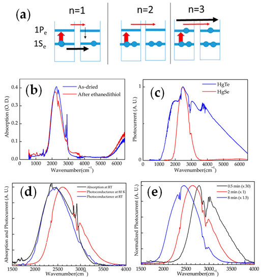 Characterization of HgSe CQDs material: (a) Schematic of doping electrons in intraband conduction. (b) Absorption spectra of HgSe CQDs on the ZnSe ATR window, deposited and dried from hexane:octane solution and exchanged by ethanedithiol. (c) Photocurrent spectra of the HgSe film and the HgTe film at 80 K. (d) Normalized absorption and photocurrent of HgSe film at room temperature and the photocurrent of HgSe film at 80 K. (e) Normalized photocurrent of HgSe film at various reaction times at 80 K with a 10 V bias [51]. Copyright 2014, ACS Nano.