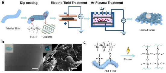 Preparation of superhydrophobic conductive fabrics. (a) Schematic diagram of the preparation of superhydrophobic conductive fabrics by electric field, Ar plasma treatment. (b) Scanning electron microscope images show the surface morphology of the fibers before and after treatment, with the inset showing the state of the dyed water droplets on the fabric surface. (i) is untreated fabric, (ii) is the fabric after PDMS/graphene wrapping. Scale bar: 2.5 μm. (c) Schematic diagram of the reaction principle between PDMS and polyester fibers in the plasma reaction chamber.