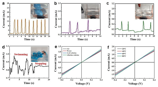 To further discuss the practical use of the strain sensors, we also performed sensing tests on the superhydrophobic sensors in different underwater environments. This includes underwater crush detection, knockdown detection, and durability under extreme conditions [28]. As shown in Figure 4a, we pressed the sample in water, and the sensor produced a regular current response. This indicates that the conductive coating still has a stable output underwater. In addition, we conducted external vibration detection tests on the underwater sensors. As shown in Figure 4b, when the outer wall of the petri dish is tapped with tweezers, a regular resistance response can be observed, and the current response signal returns from peak to baseline level after each tap [12]. In addition, the sensor exhibits a slight change in resistance when the sample is placed on the bottom of the container with an ear-washing ball (Figure 4c). High sensitivity can extend the detection range of the sensor. For example, the sensor detects small pressure changes due to vocal cord vibrations (Figure S7). This may have implications for sensing vibrations and changes in liquid surfaces. Notably, the superhydrophobic sensor can also be used in underwater wearable devices. As shown in Figure 4d, we attached the fabric sensor to the fish to monitor the swimming and resting state of the small fish in real-time. During the swimming process of the simulation fish, we successfully detected resistance changes with the sensor. As shown in Figure 4e, we tested the electrochemical stability of the sensor in different underwater environments. The fabric sensor was placed on the bottom of the container, and solutions of different pH values were added to the container. The I−V curve of the sensor follows Ohm’s law under acidic, alkaline and neutral conditions. This indicates that the fabric still exhibits stable electrochemical properties under extreme conditions [29]. Finally, we placed the fabric sensor in water at different temperatures (Figure 4f), and the fabric exhibited good electrochemical performance; from the I−V curves, the resistance of the fabric increased as the temperature increased. The drop occurred in a small range, indicating that the fabric sensor may also be used to detect changes in underwater temperature.