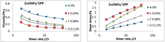 1. The parameters (shear rate and shear stress) to choose the best solutions for edible film nano edible coating and films solutions combined with ZnONPs and ZnONPs/EPP were measured using Brookfield Engineering Labs. DVN EXT. BROOKFIELD AMETK- At room temperature, the most appropriate solutions are selected. The methodology of work Put the sample transformer in a water bath at a constant temperature to maintain the desired temperature and then run the viscosity device between 10 and 60 rpm The spindle sc4-18 was selected for measurement.
