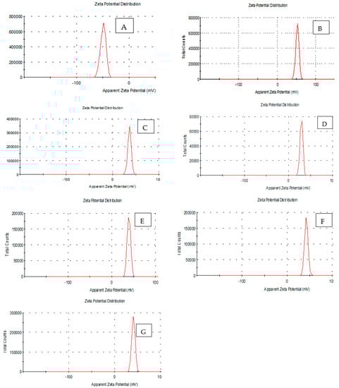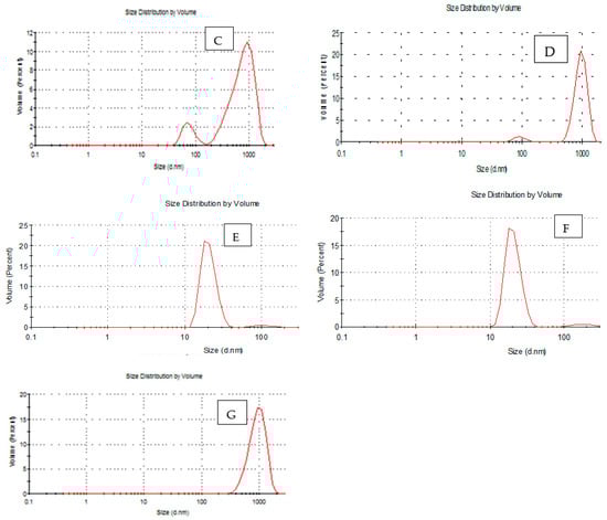 The results obtained are shown in Table 2 and Figure 2. At treatments (E20%, F40% and G60%) were higher than the treatments A 0%, B 0.02%, C 0.04%, D 0.06%, E 0.02%, F 0.04% and G 0.06% in both polydisparity index (PdI) and hydrodynamic diameter of particle size (nm). It was found that the peak was (0.648, 0.503, 0.771, and 134, 824.6 and 966 nm) for B 0.04%, C 0.08%, and D 0.12%, respectively. While the peak was E 0.04%, F 0.08% and G 0.12%, the peak was (0.639, 00.650, and 0.503 and 110.6, 188.7, and 873.6 nm) respectively, as compared with initial control samples’ A 0% practical size distribution (nm) in both poly dispersity index (PdI) 0.450 and hydrodynamic diameter of partical size (nm) 1319. A decrease of about 200 nm in the particle size around the charges in the aqueous solution was also observed after the treatment. Where the nano size appeared at around 450 nm, which led to a decrease in the particle size, the zeta potential value decreased. Suspended particles with zeta potentials of above +30 or less than −30 mV repel each other because they are considered stable, but if the zeta potential is between +30 and −30 mV, they tend to attract each other [40,41].