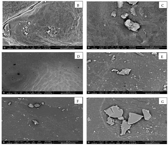 There are seven microscopic images prepared nano edible coatings and films combined with ZnONPs and ZnONPs/EPP to produce edible film. After taking the cross-section, the morphology of the surface was investigated using SEM images (Figure 4), and the surface roughness was estimated using nano-edible coatings and films. The SEM images showed that the edible films were intact and smooth without any noticeable delamination on the surface, which was found to rise with increasing concentration upon different treatments In the figure of prepared nano-edible coatings and films combined with ZnONPs and ZnONPs/EPP to produce edible films, A 0%, B 0.02%, C 0.04%, D 0.06%, E 0.02%, F 0.04%, and G 0.06% are shown. It was found that the control, a 0% treatment, has cracks in the edible film due to poor treatment that does not contain ZnONPs and ZnONPs/EPP. The treatments in the picture also showed that the addition of ZnONPs and ZnONPs/EPP characteristics produces edible films with a smooth surface flush D with some rough ridges, and treatment G found roughness of transparent appearance and droplets of elliptical shape. Treatment B was homogeneous with bubble drops compared to a spherical morphological droplet. The edible film contains a homogeneous solution with some compact fine grains and an intact smooth crystal morphology in a continuous matrix in general. It can be concluded that these studies are useful for learning about the microstructure and membrane morphology, which can help in selecting the edible nanofilm formulas for coating and packing. Our results are in agreement with those obtained by [38]). SEM images found that the elegant CMC film was smooth and intact without any deformation, and the surface was clear. The surface roughness was slightly increased in the films supplemented with grape seed extract, which was confirmed by the higher surface roughness of the CMC/grape seed extract film compared to the elegant CMC film [14,45]. The presence of a gelatinous mass with cracking in the control film was observed, which may be due to the incompatibility of the complex polymer with pomegranate peel extract. Generally, the scanning microscopy study may be useful for recognizing the microstructure and morphology of the produced films, which can be helpful in choosing the proper film formula for coating and packaging. Purposes. Also, the color appearance of produced films may be important because it could affect consumer acceptance of coated items [33].
