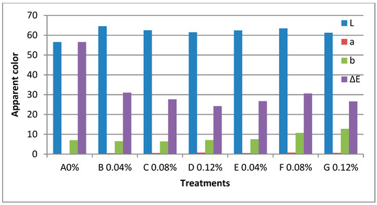 where L*, a*, and b* represent the film sample values, and L*s, a*s, and b*s represent the standard whiteboard values.As a background, Maria-Ioana Socaciu et al. (2020) represent values as background and take three readings for each film. and E = (L)2 + (a)2 + (b)2, where L, a, and b represent the colour difference between the film sample and the standard plate, respectively. According to [21,22].