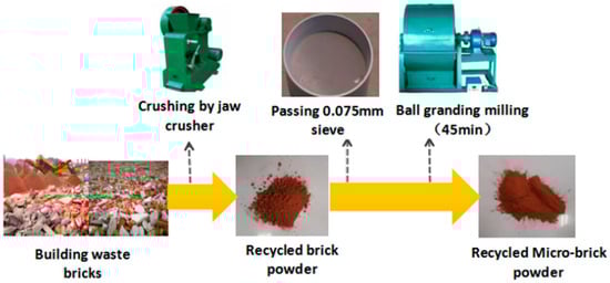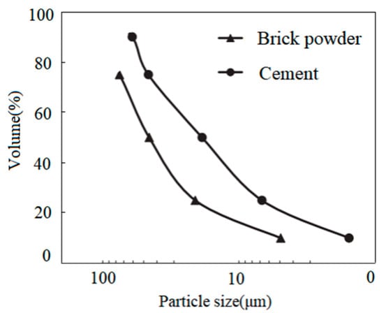 The recycled brick powder comes from the sintered waste clay bricks produced by demolition in Zhengzhou city; the compressive strength of the waste bricks was MU20~MU25. Figure 1 shows the preparation process of recycled brick powder. Bricks were initially selected from construction waste, then crushed by a jaw crusher and sifted into a 75 μm powder. After 45 min of ball milling, the recycled brick powder was activated and finally 32.8 μm was obtained, which is similar to cement fineness. The particle size distribution is shown in Figure 2 and Figure 3. Generally, a very fine recycled brick powder contributes to the activity and filler effect in its pozzolanic cement composites. The main indicators and components of recycled brick powder are shown in Table 2.