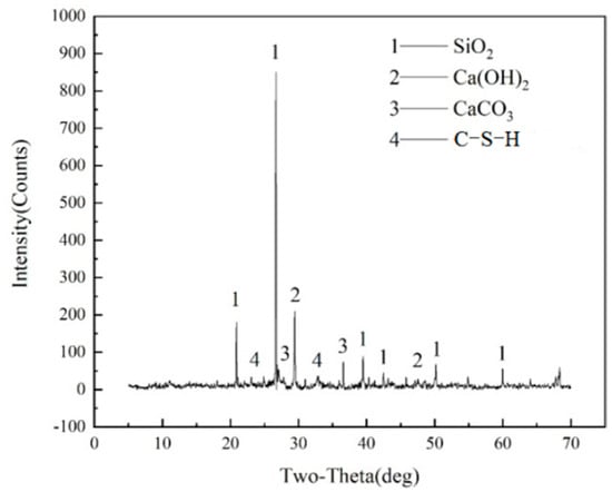 The reclaimed micropowder was milled by a SM500×500 ball mill, after which the mortar specimens were prepared by replacing cement with a 30% content, and an XRD analysis was carried out. Figure 4 shows that the sample mainly contained SiO2, Ca(OH)2, CaCO3 and C-S-H. In Figure 5, the diffraction peak of the Ca3Al2O6 crystal may result because the recycled micropowder was not ball milled and contains some cement mortar. The Ca3Al2O6 crystal may be the product of secondary hydration. The SiO2 in the sample after ball milling is mainly from sand and recycled fine powder in the aggregate, and the Ca(OH)2 is mainly from cement hydration. This indicates that after mechanical ball-milling excitation, the SiO2 in some recycled micropowders is activated and reacts with the hydration product of cement, Ca(OH)2, to form a C-S-H gel, which helps to improve the strength of the materials. The recycled brick powder is prepared from waste clay bricks, with silicon accounting for most of the composition of the clay bricks. A previous investigation reported that the high content of silicon and its oxide contained in RBP contribute to the pozzolanic reaction of cementitious materials [33]. However, because no hydrated component is contained in RBP, incorporating a high-volume of RBP into cement composites is not recommended.